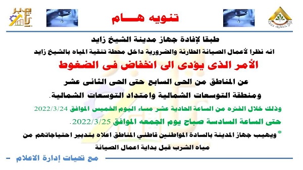 أعلن جهاز تنمية مدينة 6 أكتوبر، قطع المياه عن عدد من المناطق بمدينة الشيخ زايد بسبب أعمال تنقية مياه مدينة الشيخ زايد.