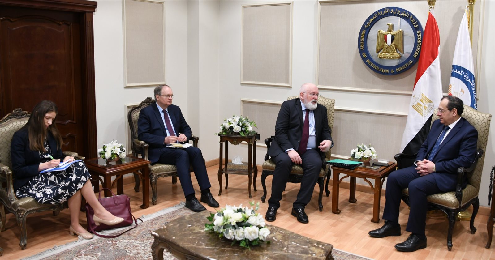 استقبل المهندس طارق الملا وزير البترول والثروة المعدنية فرانس تيمرمانس نائب رئيس مفوضية الاتحاد الأوروبي للصفقة الأوروبية الخضراء والمفوض الأوروبي للعمل المناخي والوفد المرافق له حيث تم بحث مجالات التعاون المختلفة بين مصر والاتحاد الأوروبي وخاصة في مجالات الطاقة وسبل تكامل جهود التحول الطاقى وتعزيزها لتحقيق المستهدفات المرجوة للحفاظ على المناخ والبيئة، كما تم استعراض الفرص المتاحة لزيادة مجالات التعاون في اطار العلاقات المتميزة والتاريخية بين الجانبين خاصة في مجالات الهيدروجين والغاز والكهرباء.