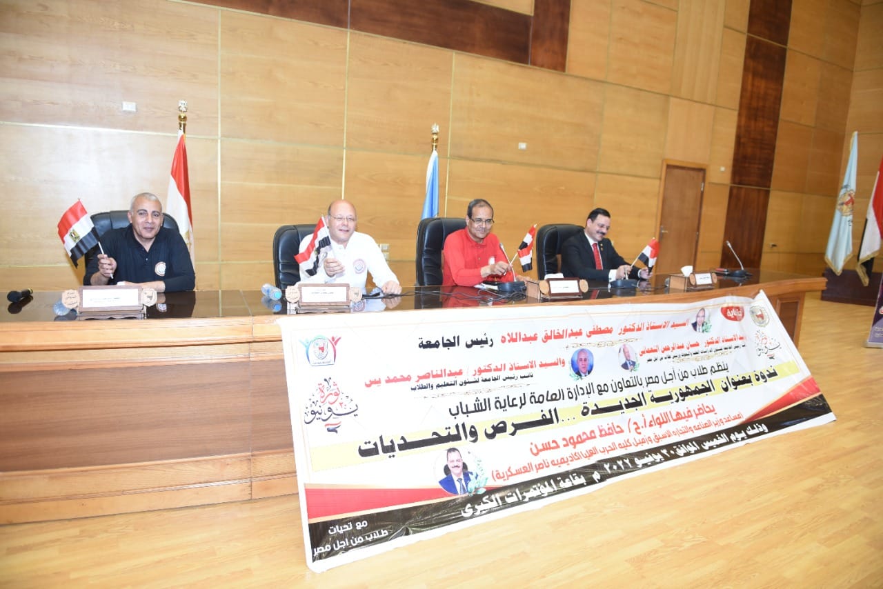 وحاضر خلال الندوة اللواء أركان حرب المهندس حافظ محمود حسن زميل أكاديمية ناصر العسكرية العليا، وذلك بالمركز الدولي للمؤتمرات بالمقر الجديد للجامعة، بحضور الدكتور حسان النعماني نائب رئيس الجامعة لشئون الدراسات العليا والبحوث ورئيس طلاب من أجل مصر، والدكتور عبدالناصر يس نائب رئيس الجامعة لشئون التعليم والطلاب، والمحاسب أشرف القاضي أمين عام الجامعة، والعميد نبيل شحاتة المستشار العسكري للمحافظة، والدكتور علاء غالب منسق طلاب "من أجل مصر"، وصبري إبراهيم مدير عام رعاية الشباب المركزية، ومحمد حسن رئيس اتحاد طلاب الجامعة، ولفيف من عمداء الكليات ووكلائها وأعضاء هيئة التدريس والعاملين بالجامعة.