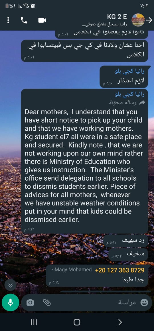 أصيب أطفال مدرسة privilege بحالة من الهلع والفزع بالمعراج السفلي المعادي، بعد ان قررت المدرسة إخراجهم من الفصول وتركهم بساحة المدرسة وإنهاء اليوم الدراسي فجأة؛ بسبب التغيرات الجوية الأمطار والكسوف الجزئي.