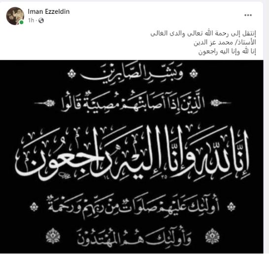 وكتبت: «انتقل إلى رحمة الله تعالى والدي الغالي.. الأستاذ محمد عز الدين.. إنا لله وإنا إليه راجعون».