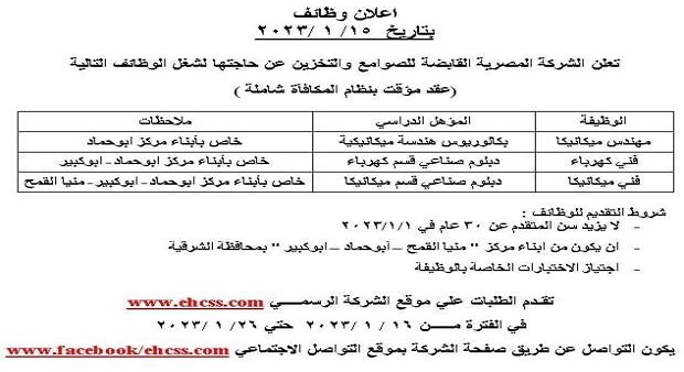 3- وظيفة فني ميكانيكا، على أن يكون المؤهل دبلوم صناعي قسم ميكانيكا، ومتاح التقديم عليها لأبناء مركز أبو حماد وأبو كبير ومنيا القمح.