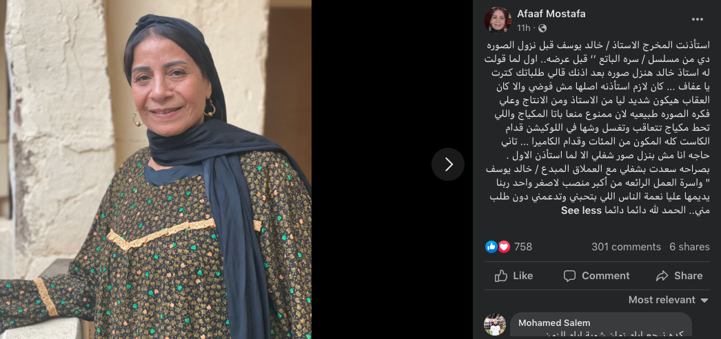 وأضافت عفاف مصطفى: "وعلى فكره الصورة طبيعية لان ممنوع منعا باتا المكياج واللي تحط مكياج تتعاقب وتغسل وشها في اللوكيشن قدام الكاست كله المكون من المئات وقدام الكاميرا.. تاني حاجه انا مش بنزل صور شغلي الا لما استأذن الأول".