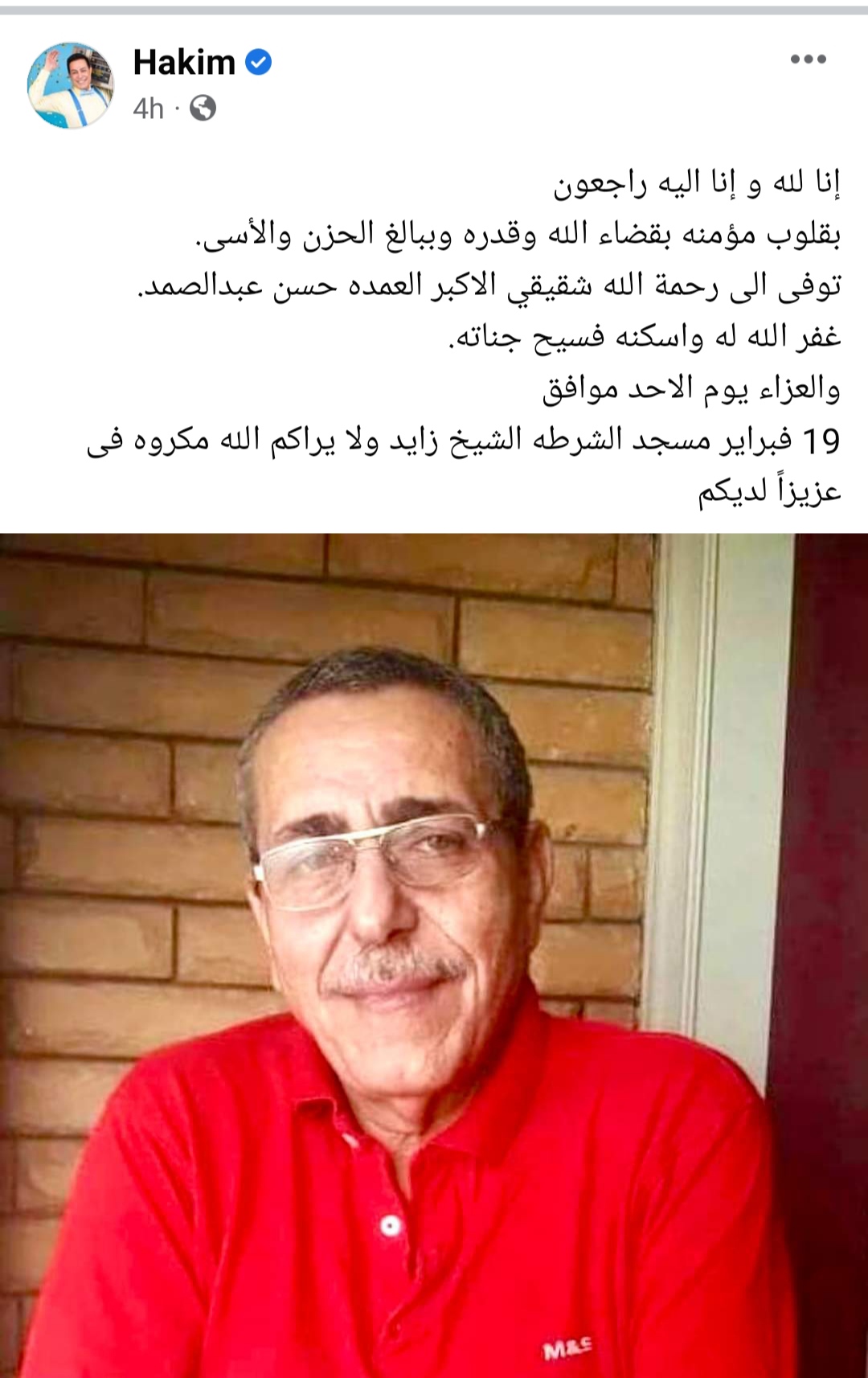 وتابع: «غفر الله له واسكنه فسيح جناته، والعزاء يوم الأحد موافق ١٨ فبراير مسجد الشرطه الشيخ زايد ولا يراكم الله مكروه في عزيزًا لديكم».