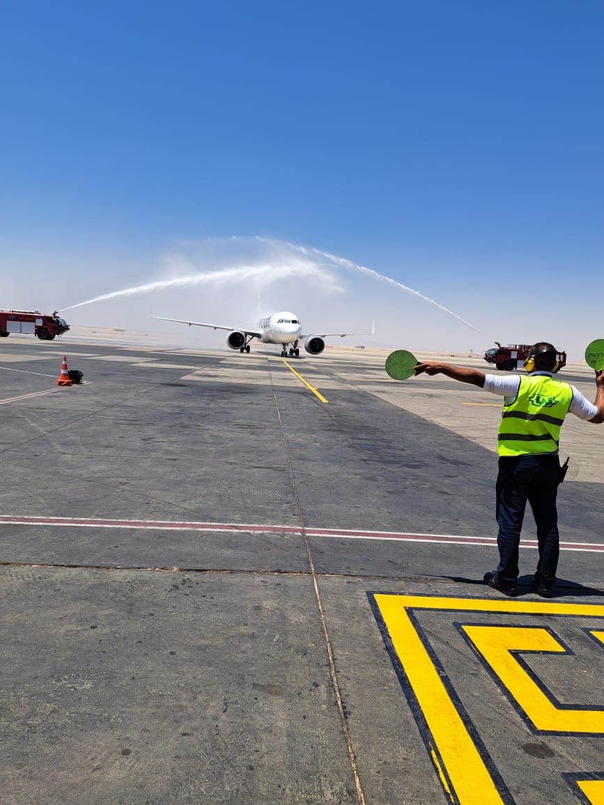 تم استقبال الطائرة بتقليد رش المياة Water Salute وتم الترحيب بالركاب وتقديم كافة التسهيلات لإجراءات الوصول.