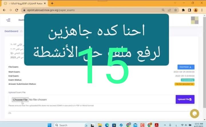 كما يتم تحميل ملف التقييم للطالب باللغة التى يؤدى بها الامتحان ثم طباعته وأداء الأنشطة وإعادة رفعه بعد الإنتهاء منه على المنصة الإلكترونية للطلبة المصريين فى الخارج كما يتم تحميل الملف ورفعه بعد استكماله بداية من يوم وضعه على المنصة وللفترة المتاحة.
