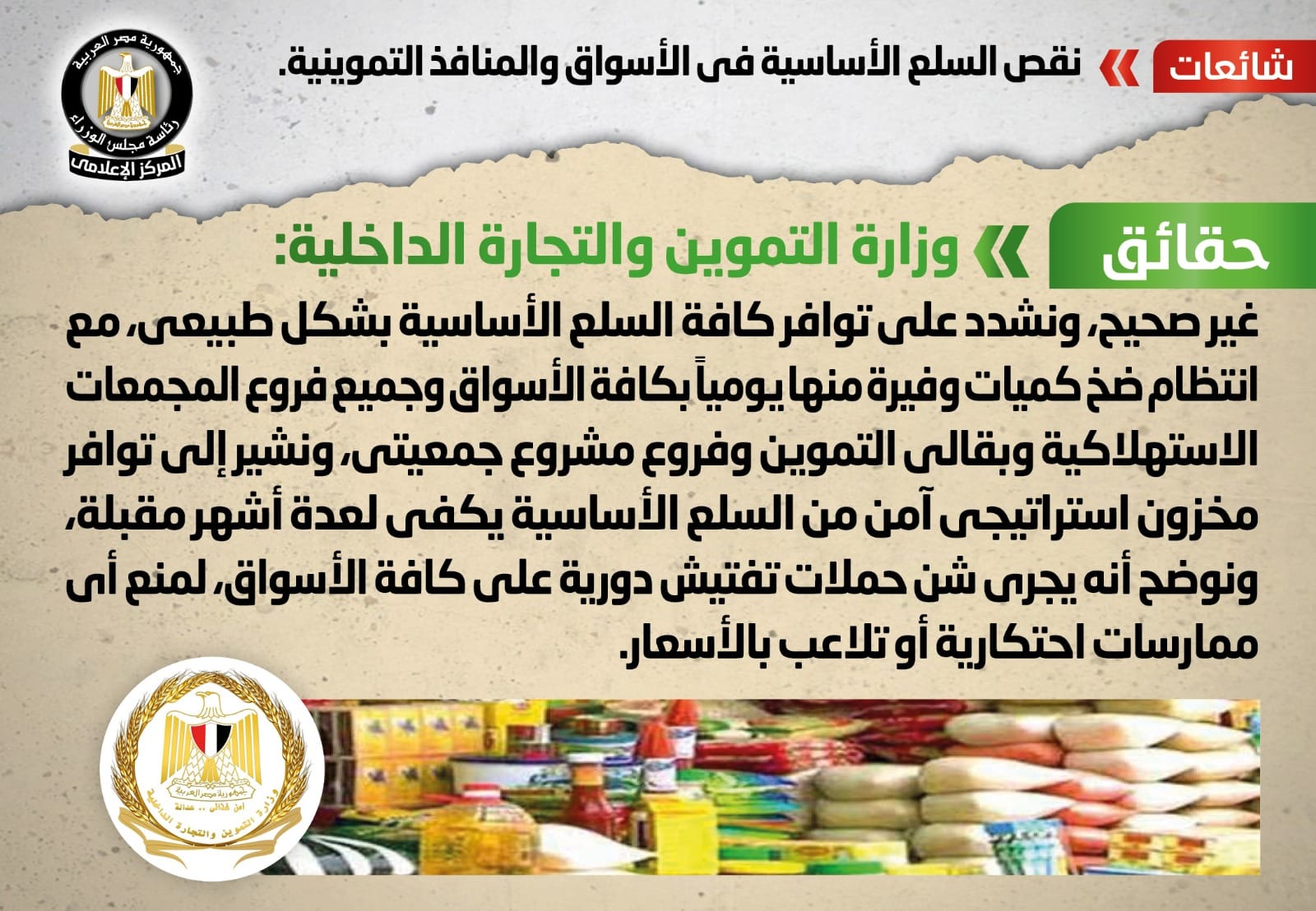 انتشر في بعض المواقع الإلكترونية وصفحات التواصل الاجتماعي أنباء بشأن نقص السلع الأساسية في الأسواق والمنافذ التموينية، وقد قام المركز الإعلامي لمجلس الوزراء بالتواصل مع وزارة التموين والتجارة الداخلية، والتي نفت تلك الأنباء، مُؤكدةً أنه لا صحة لنقص السلع الأساسية في الأسواق أو المنافذ التموينية، مُشددةً على توافر كافة السلع الأساسية بشكل طبيعي، مع انتظام ضخ كميات وفيرة منها يوميًا بكافة الأسواق وجميع فروع المجمعات الاستهلاكية وبقالي التموين وفروع مشروع جمعيتي، مُشيرةً إلى توافر مخزون استراتيجي آمن من السلع الأساسية يكفي لعدة أشهر مقبلة، موضحةً أنه يجري شن حملات تفتيش دورية على كافة الأسواق، لمنع أي ممارسات احتكارية أو تلاعب بالأسعار.