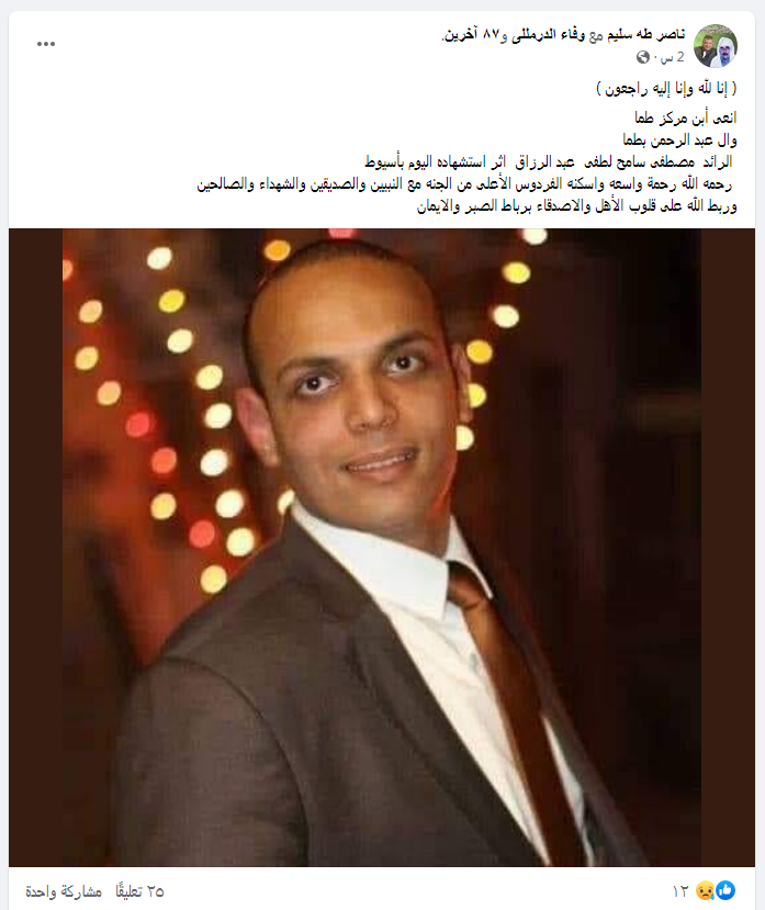 واختتم منشوره قائلًا: «استشهاد الرائد مصطفي عبدالرزاق، معاون أول مباحث مركز شرطة الفتح، والله نشهد الله أنك كنت على خلق، ونعم الصاحب، نسألكم الدعاء له».