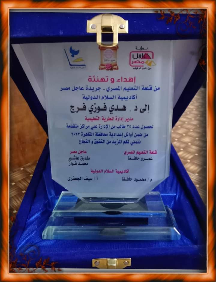 قام عمرو حافظ مؤسس قلعة التعليم المصرى بإهداء الدكتورة هدى فوزى مدير إدارة المطرية التعليمية، وفريق عمل إدارة المطرية التعليمية درع التكريم متمنيًا دوام النجاح والتوفيق.